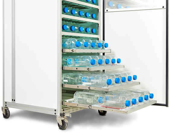 Heating of only the exactly needed space for the cultivation of the seed cultures and the production cultures results in considerable energy savings compared to large warm rooms. Temperature range is +5°C above room temperature to +50°C, continuously adjustable. With protection against over-heating.