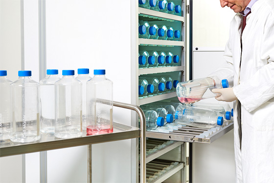 Roller bottle incubator for 90 bottles for the production of e.g. vaccines using adherent cell cultures.