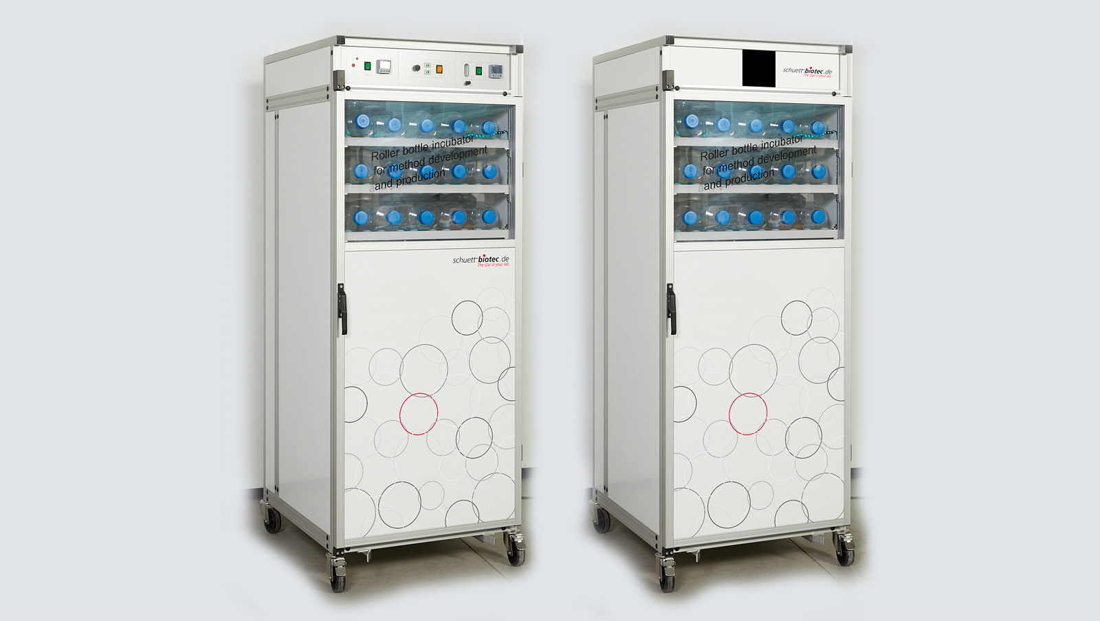 | INCUDRIVE 90Touch Roller Bottle Incubator, 230 V for rolling 90 cell culture bottles with Ø 120 mm, 270 mm length (2 L volume) or 45 cell culture bottles with Ø 120 mm, 520 mm length (5 L volume), with 9 fixed-mounted roller inserts (level 1-9), with circulating air temperature control system, as well as Touchscreen (Screen recorder) for production of monolayer cell cultures. |